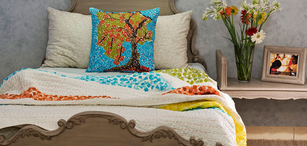 In a bedroom, cushions on the bed are best arranged on a quilt or bedspread. Sometimes just the sight of a lovely quilt is like a balm to the senses as it casts a spell of comfort, warmth and repose. Calyz has a collection of attractive handmade cotton quilts designed with the studio’s signature textile collage art technique by which hundreds of small colourful bits of fabric are affixed and stitched on the fabric to create stripes, stars, foliage, flowing vines and flowers. This technique allows for large patterns and repeats.