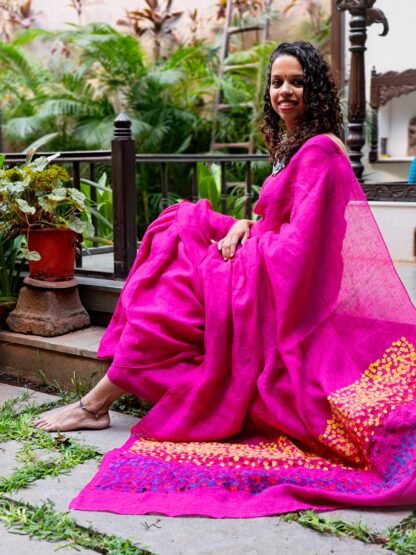 Our handcrafted pink linen saree is a mesmerizing blend of traditional elegance and modern allure. Each saree is painstakingly crafted by skilled artisans, showcasing intricate details such as our handcrafted collage technique on the pallu of saree  and delicate embroidery flowing over, elevate its beauty. The bright  pink hue of the linen exudes a feminine and graceful charm, perfect for enhancing your natural radiance. Its lightweight and breathable fabric ensure comfort, while its drape lends an ethereal quality to your silhouette. Our handcrafted pink linen saree is not just a garment but a work of art, celebrating craftsmanship and adding a touch of timeless beauty to your wardrobe.
