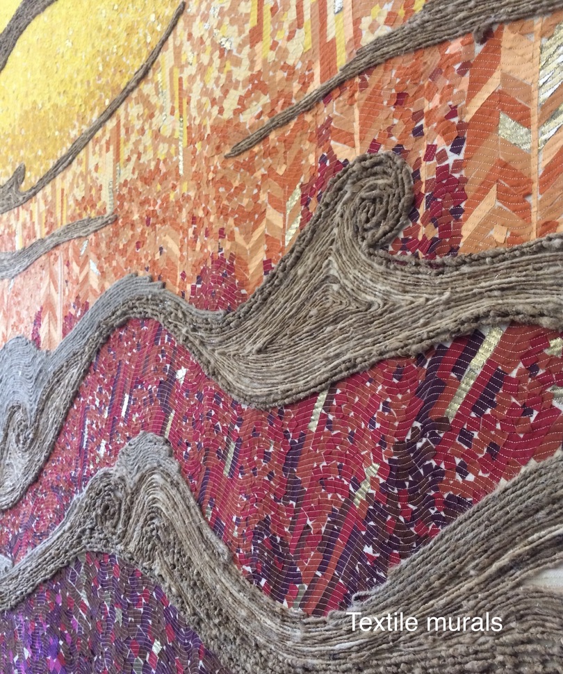 The collage fabric technique was perfect for this piece. It helped build up the gradation of colour from dark to light tones. The highlight was the central yellow part that depicted the abundance of sunshine. Something to remind us the importance of the solar power that is connected with all abundance of life and happiness. The yellow part then blends into greens and blues to depict the sky and the completeness of life.The vibrant colours were intermingled with coarse textures of the bark by the use of jute and silk. The coarseness of silk complimented the wave forms and added a wonderful contrast. The mosaic pieces were sewn down with a wave stitch. The entire piece has a banana fibre backing for it to hang straight and flat. The reverse of the piece is also embellished with and element of prop roots with jute strings covered in fabric ending with a tassel.